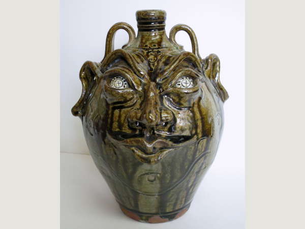 Every April, American Folk Art honors a wild pottery tradition that began regionally in the early 1800’s. No one knows for sure when the first face jug was created, but around the mountain region of North Carolina, face jugs began to be created for the storage of moonshine around 1810. The faces, snakes and other foreboding additions were added to the clay jugs to scare the children, so they would not drink the contents. In the unadorned world of the 1800’s, the face jug was remarkable and the tradition allowed for much creativity and fun amongst potters. Face jugs continue to be created in the same fashion as of old, which includes hand digging and mixing regional soils to make the clay, using regional materials to make the glazes, in many cases using broken plates for the teeth, and wood-firing the jugs to 2300 degrees. They are still in use, holding moonshine, but not necessarily scaring the kids.