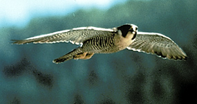 The peregrine falcon is a fast raptor that can dive at speeds over 200 MPH. It has sharp talons used to grab prey and a sharp, curved beak. It averages 15-21 inches long, and has a wingspan of 40 inches. Peregrines are found on every continent except Antarctica. The peregrine falcon eats a wide variety of birds, including jays, pigeons, shorebirds, robins, and ducks. Rather than build their own nests, falcons utilize tree cavities, rock cliffs, ledges, and high bridges to lay eggs and raise their young. Female falcons lay one clutch of 3-4 eggs each year. Females are larger and dominate the males. Peregrine falcons are an endangered species success story. Elimination of DDT in the United States, reintroduction, and nest-box programs in urban areas have contributed to their return. DDT, a broad-spectrum pesticide that was widely used in the US until several decades ago, caused an alteration in the falcons� calcium metabolism, and their eggshells became so thin that undeveloped birds perished. While the US no longer uses DDT, other countries around the world continue to use it, and peregrine falcons continue to ingest and bioaccumulate DDT through the small birds they eat. The peregrine falcon was removed from the federal endangered species list in late 1999, but the bird remains on the North Carolina list of endangered species. (Images provided by Chimney Rock Park and the National Park Service.)