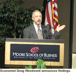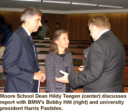 The findings of the study reveal that, after 16 years, BMW has become more than a manufacturing branch plant of the famous German automaker. Combining manufacturing, community and educational activities, it occupies a distinctive position in the South Carolina economy, the report says. The study stresses that as BMW invests and creates jobs for South Carolinians, it also demonstrates how successful businesses can address environmental challenges and serve as models for sustainable enterprise. The economic-impact study was conducted earlier this year using BMW�s activity in 2007. Moore School Dean Hildy Teegen (center) discusses report with BMW�s Bobby Hitt (right) and university president Harris Pastides.�The immense impact of BMW is felt across the Upstate and throughout South Carolina,� said Dr. Douglas P. Woodward, professor of economics at the Moore School. Woodward and Dr. Paulo Guimaraes, also a Moore School economics professor, conducted the study. The study focused on three key economic dimensions of BMW�s investment.